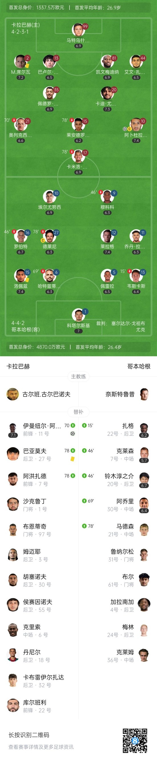 第27分钟,卡拉巴赫首开记录!比卡略右路弧顶远射打在远端立柱上,第二点祖比尔门前补射破门,卡拉巴赫1-0哥本哈根。↓